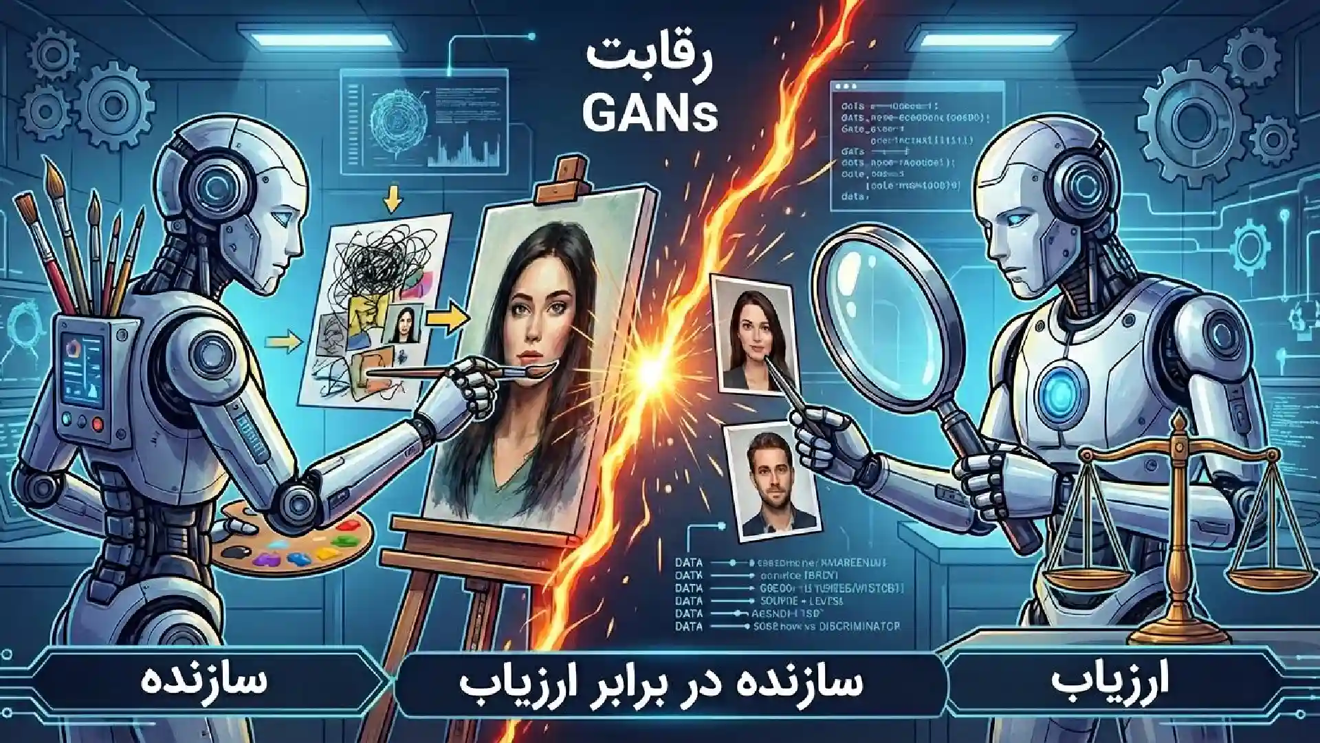 این شبکهها با به کارگیری دو مدل (یکGenerator یا سازنده و یک Discriminator یا ارزیاب) که علیه یکدیگر رقابت میکردند، توانستند تصاویری تولید کنند که به تدریج واقعیتر به نظر میرسیدند. سازنده تلاش میکرد تصویری واقعی بسازد و ارزیاب تلاش میکرد تصویر ساختگی را از واقعی تشخیص دهد. این رقابت باعث پیشرفت سریع هر دو مدل میشد.