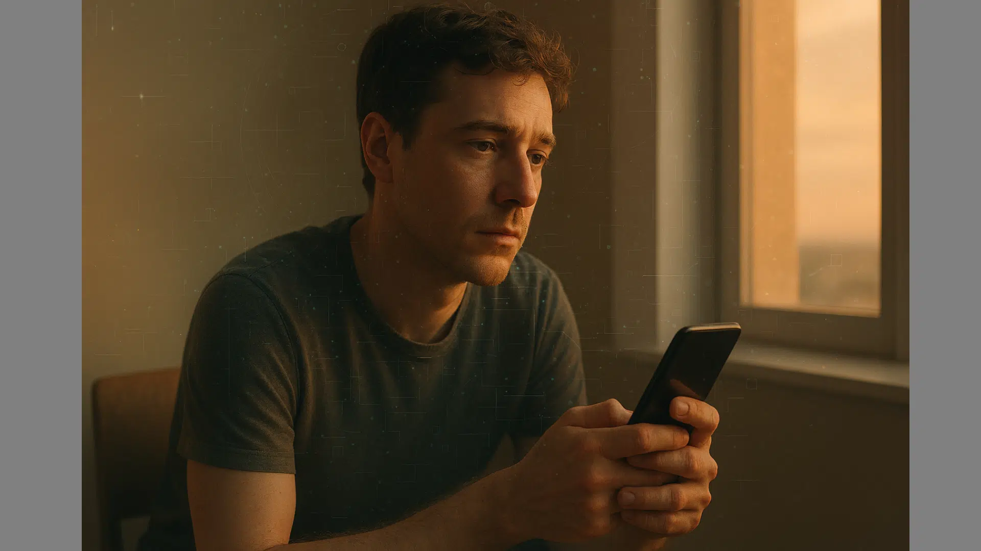 Around the person, very subtle digital elements are visible: