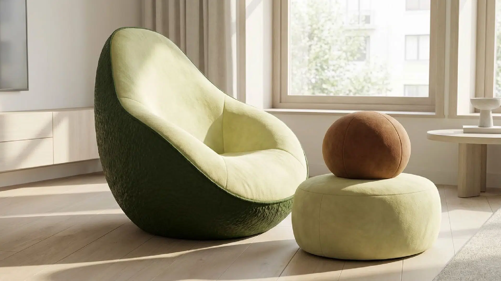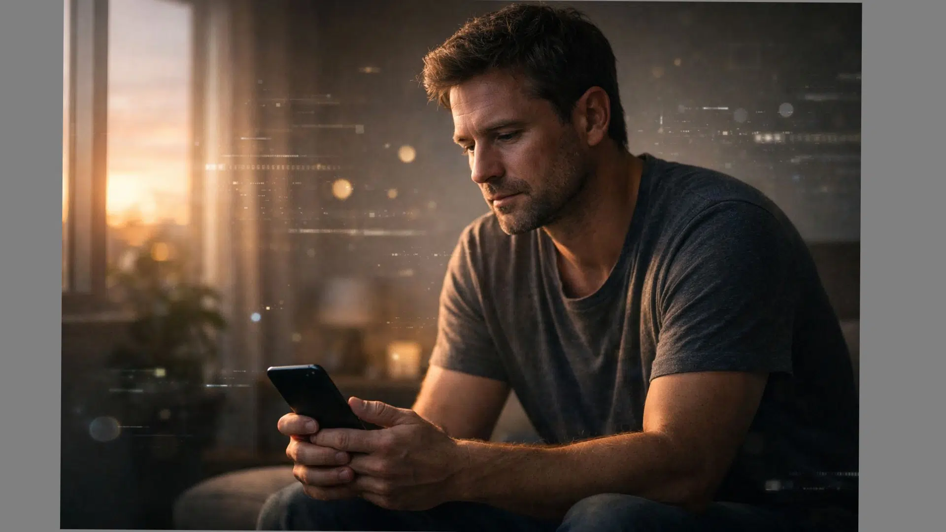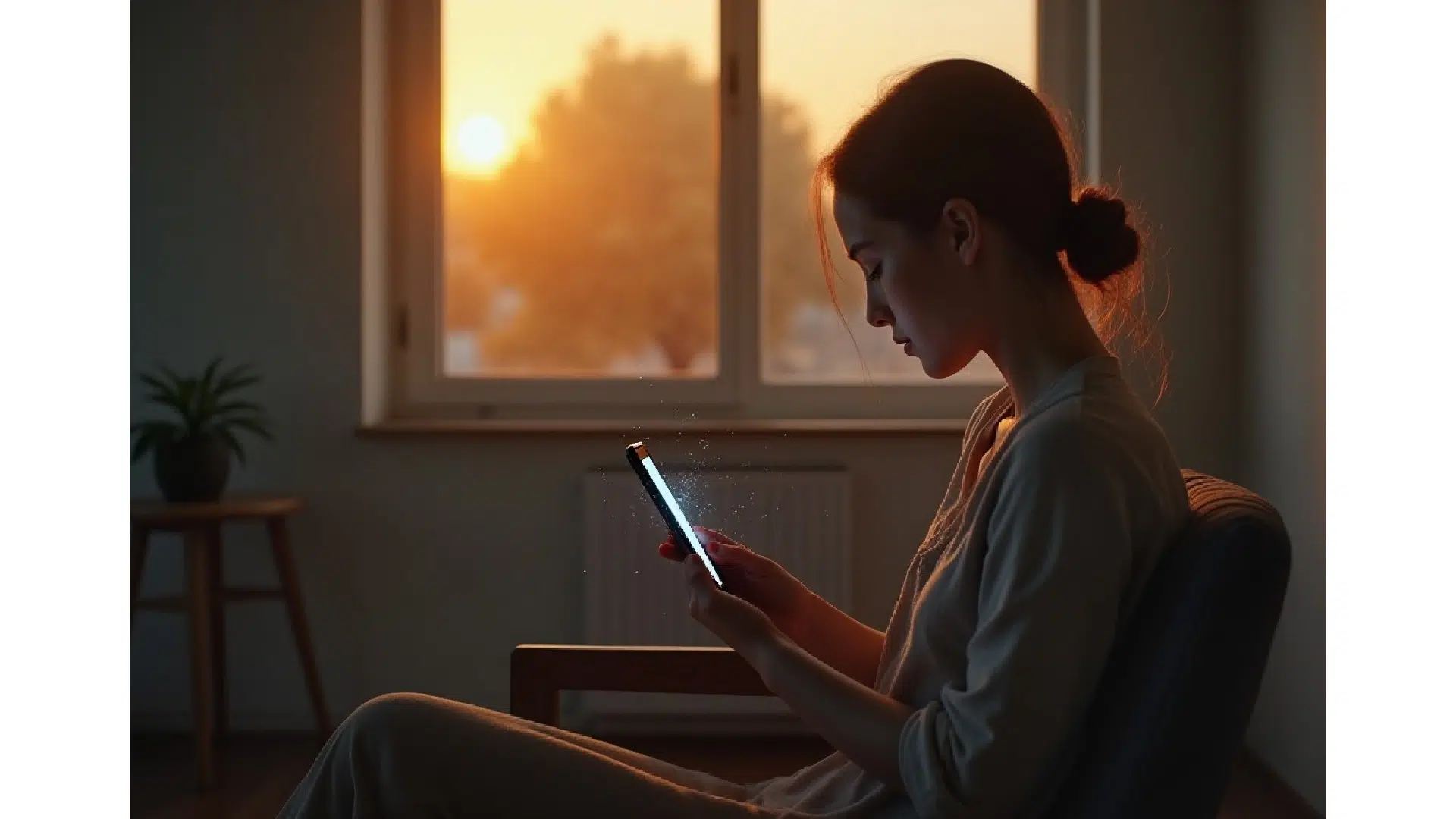 The scene takes place in a simple, modern room with soft sunset light entering through a window.