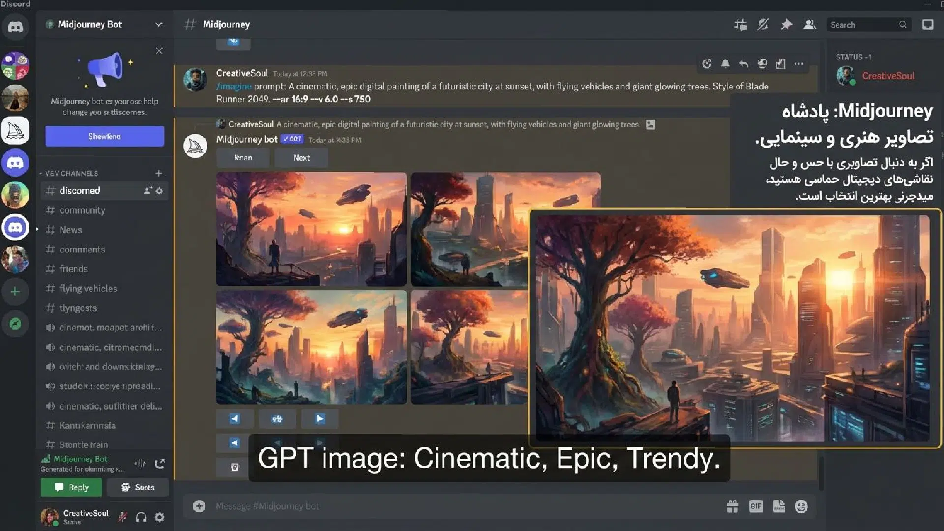 • Midjourney: پادشاه تصاویر هنری و سینمایی. میدجرنی که از طریق پلتفرم دیسکورد کار میکند، به دلیل سبک هنری خاص و خروجیهای بسیار چشمنوازش مشهور است. اگر به دنبال تصاویری با حس و حال نقاشیهای دیجیتال حماسی هستید، میدجرنی بهترین انتخاب است، هرچند دیگر پلن رایگان ندارد.