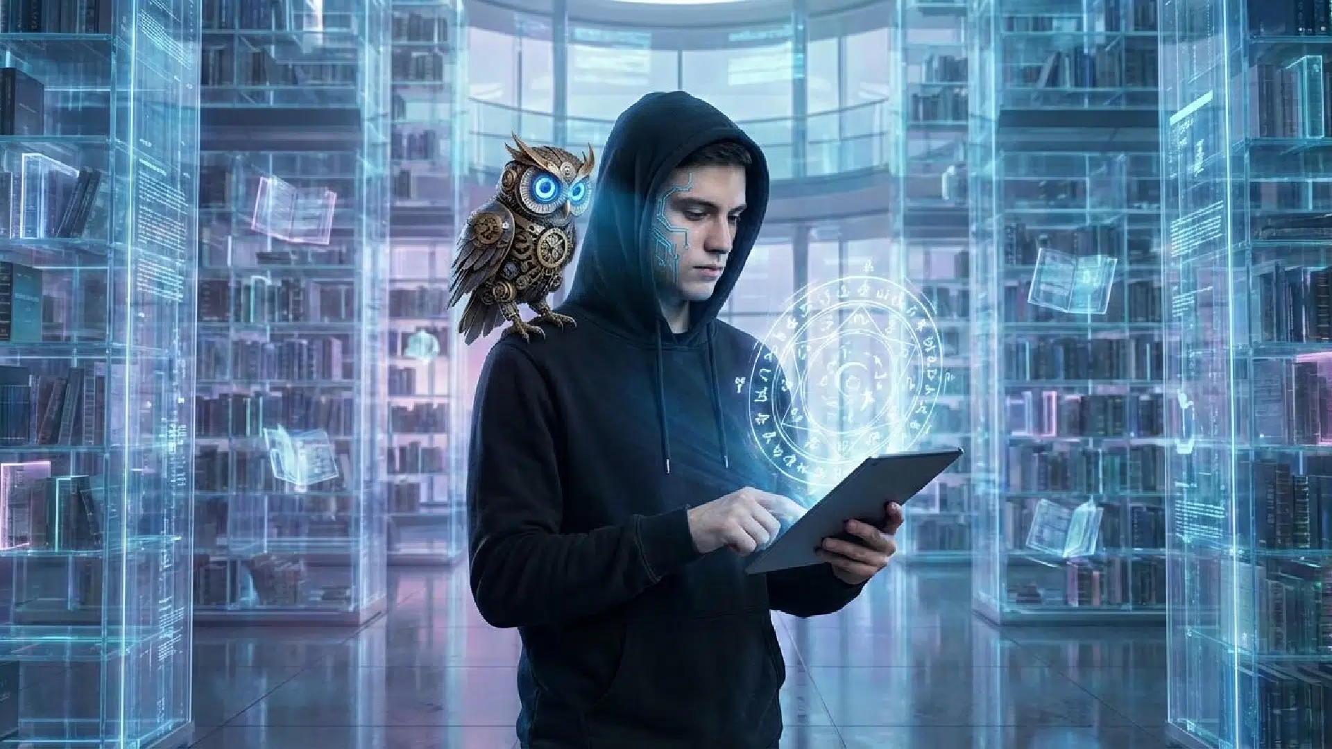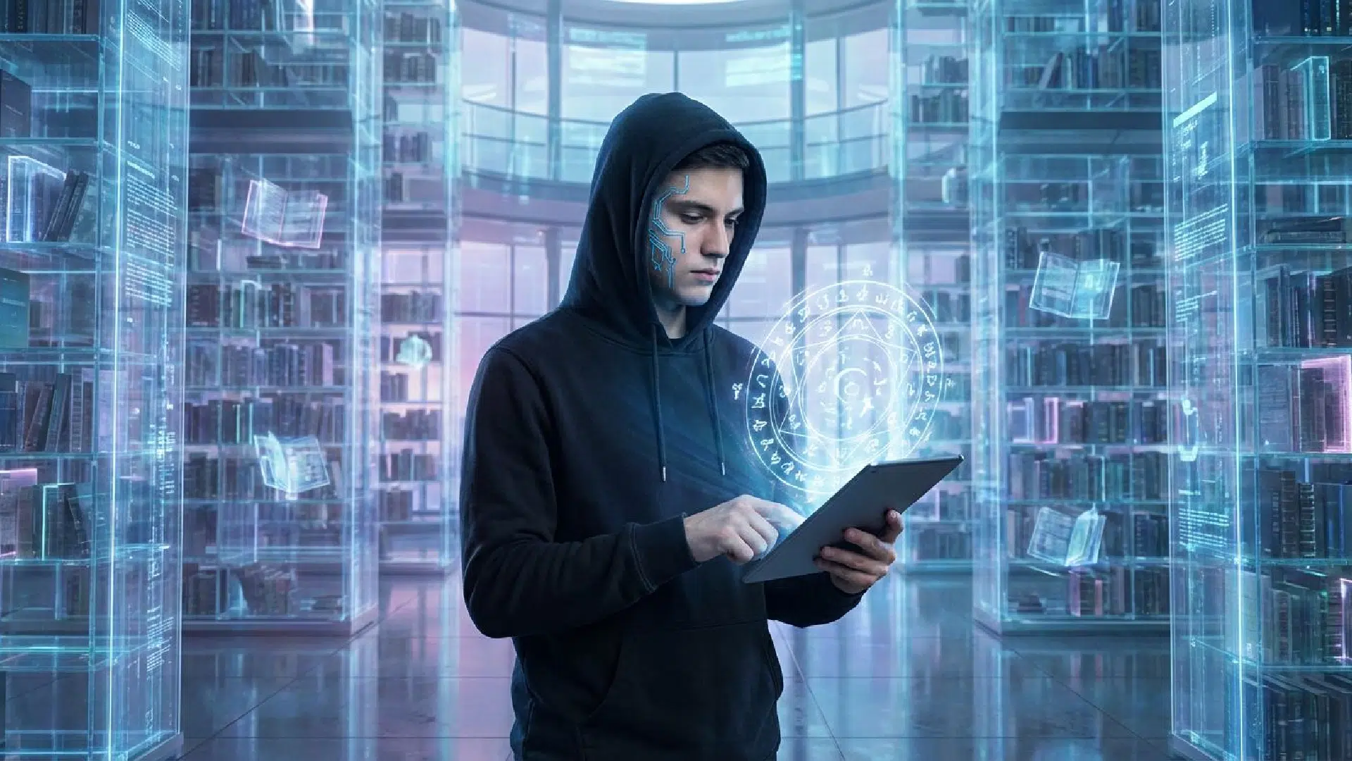 A young cyberpunk wizard, with neon blu’ circuits on his cheek, wearing a dark hoodie, holding a glowing digital spellbook in his hands. He is standing in a vast, futuristic library ’Ith holographic shelves. Detailed, cinematic lighting, photorealistic.