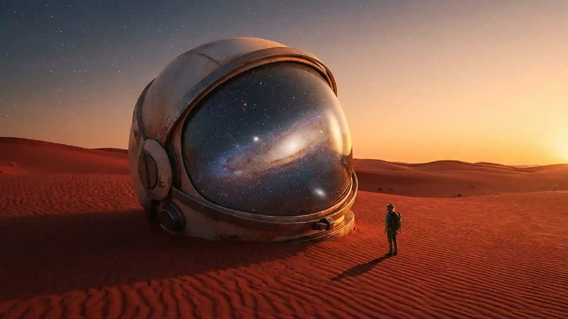 A giant astronaut helmet lying half-buried in a vast desert of red sand, with stars and galaxies reflected on its visor. A tiny, lone figure stands looking at it. Surreal, epic scale, wide-angle shot, golden hour lighting, fine art photography.