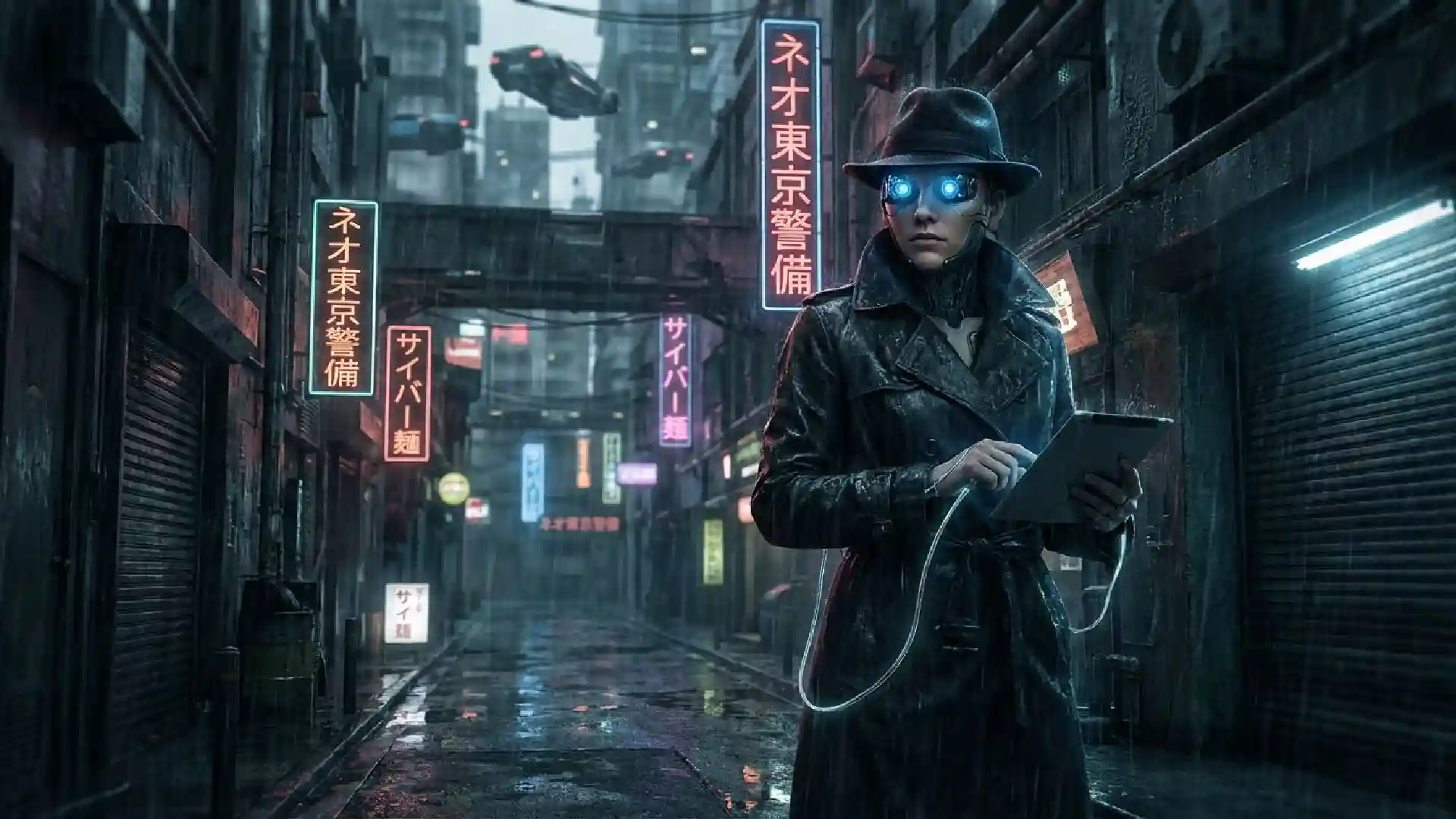 A female cyborg detective with glowing optic implants, wearing a long trench coat, standing in a rain-soaked, neon-lit alleyway in a futuristic Tokyo. Reflections on the wet ground, shallow depth of field, cyberpunk aesthetic, Blade Runner style, cinematic, 8k.