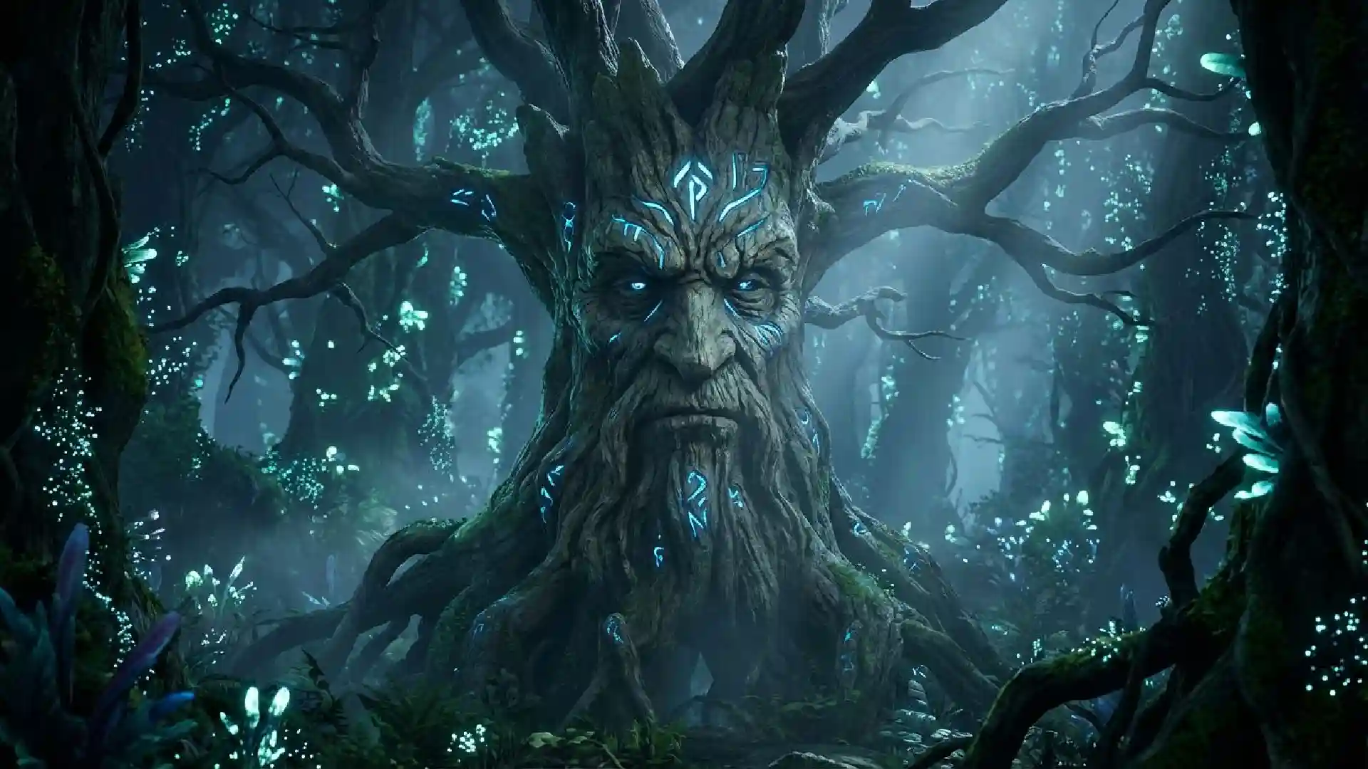 A majestic and wise ancient tree spirit, with a face carved into the bark and glowing blue runes, standing in the middle of an enchanted, bioluminescent forest at night. Cinematic lighting, volumetric fog, fantasy concept art, ultra detailed, photorealistic, Unreal Engine 5 render.
