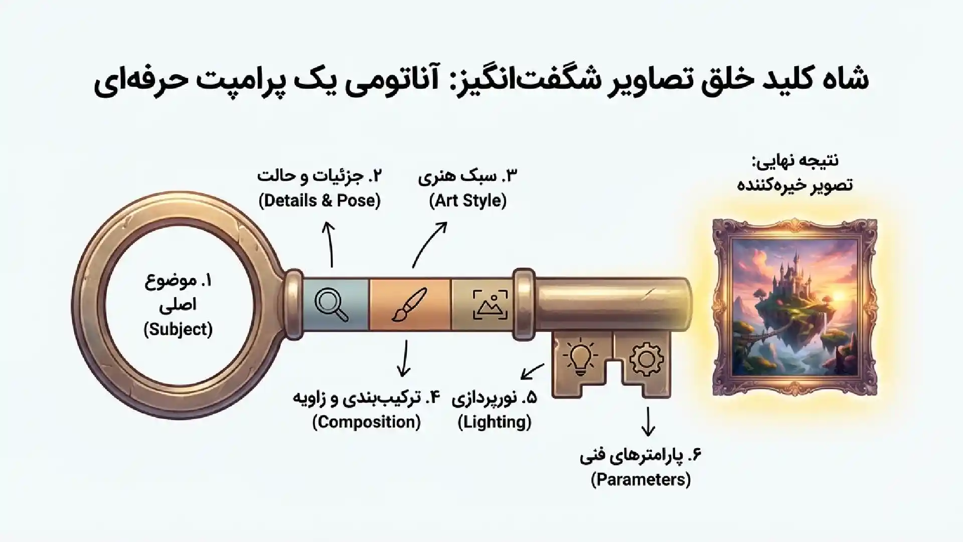 [موضوع اصلی] + [جزئیات و حالت موضوع] + [سبک هنری] + [ترکیببندی و زاویه دوربین] + [نورپردازی] + [پارامترهای فنی]